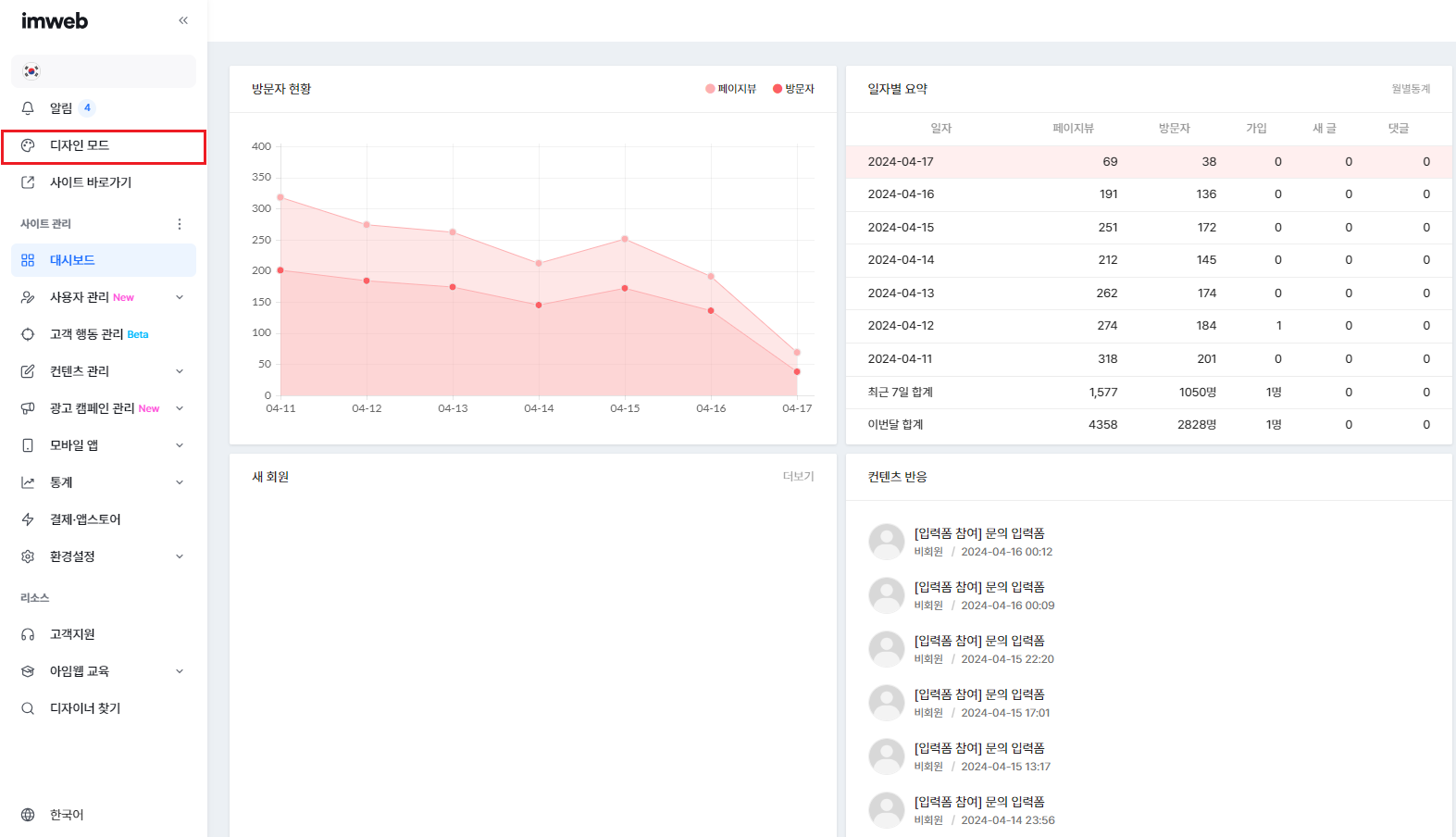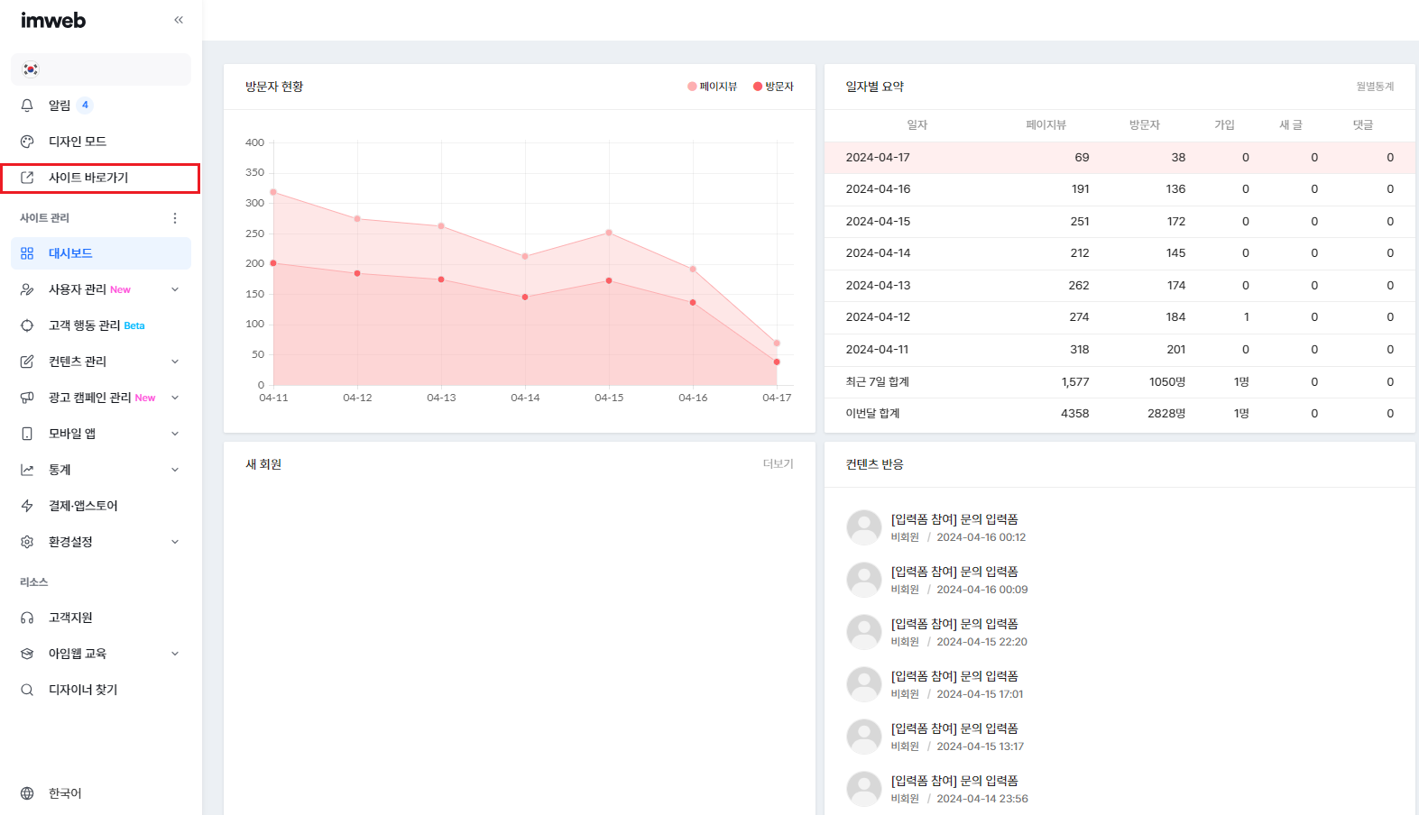 관리자페이지 - 대시보드의 중앙에 있는 [컨텐츠 반응] 또는 좌측의 [컨텐츠 관리]에서 고객 문의 데이터를 확인하실 수 있습니다.