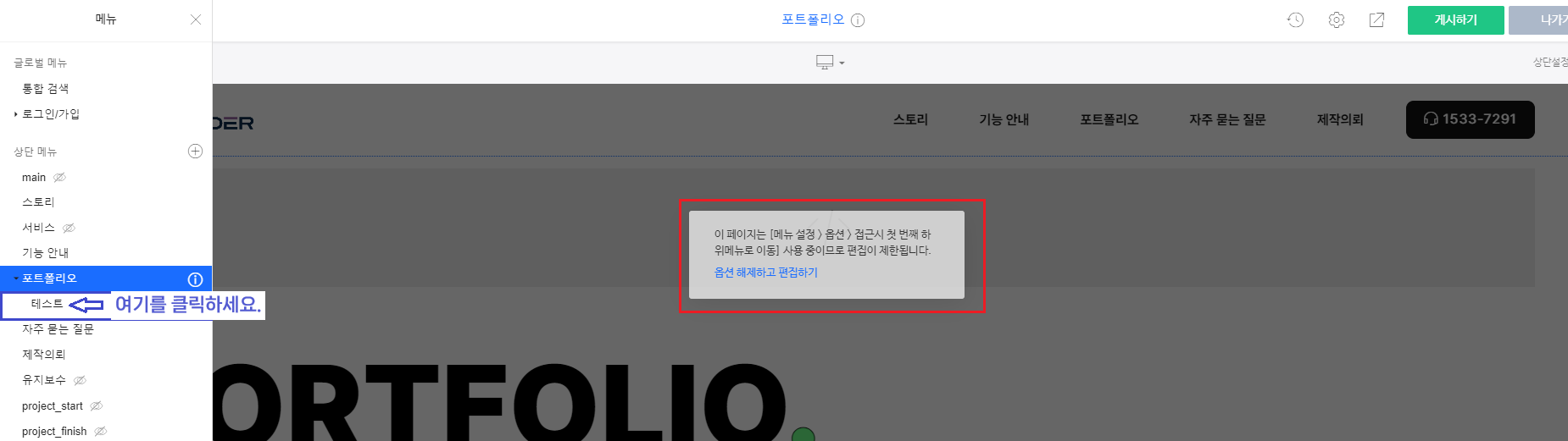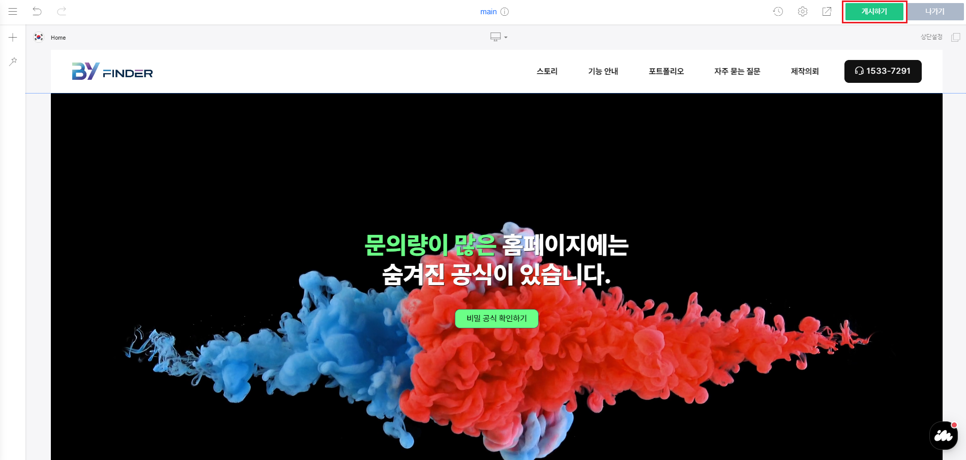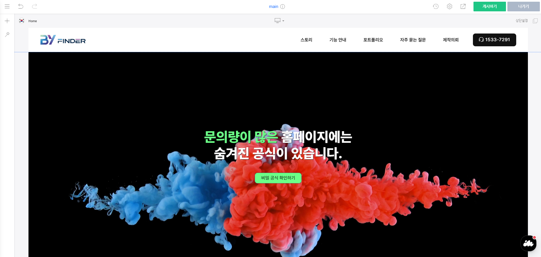 아래와 같이 홈페이지의 메인페이지가 나온다면 디자인 모드에 성공적으로 접속하신 겁니다.