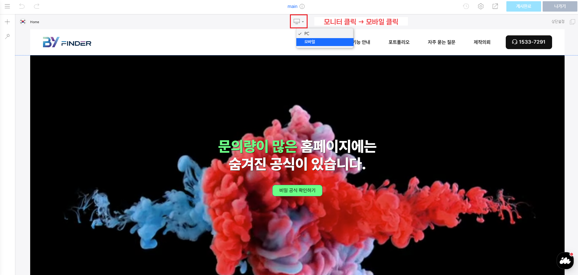수정 방법은 동일하며 아래 이미지를 참고하시어 모바일 디자인 모드로 접속해 주세요.